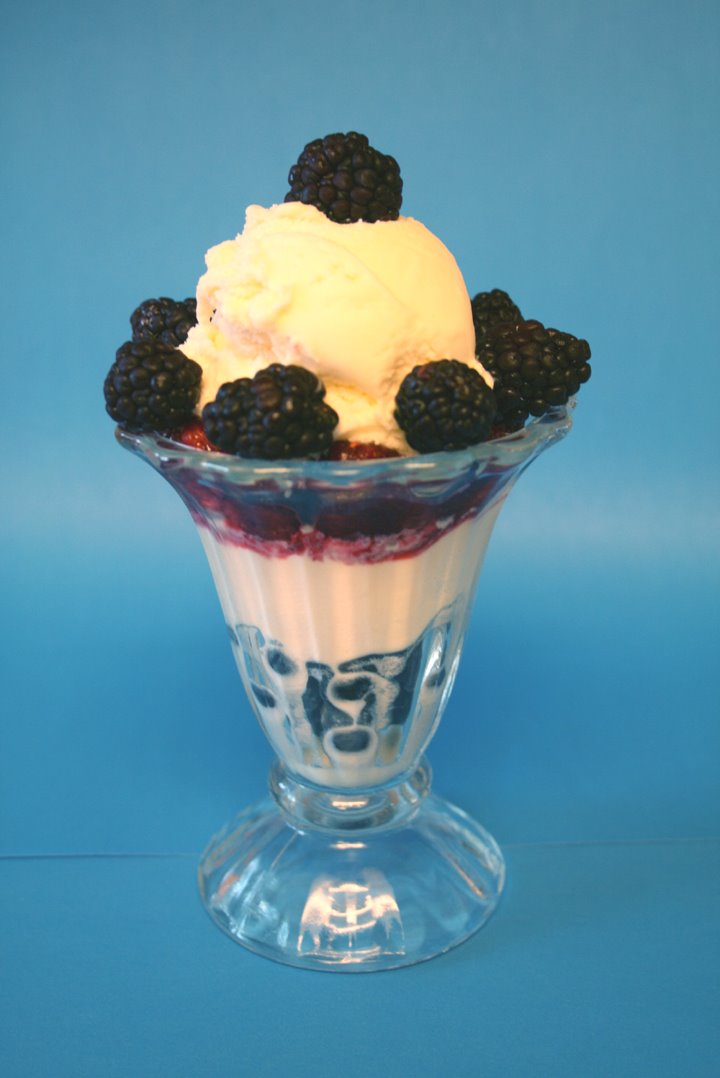 Greetings fellow berry-lovers! So nice of you to stop by. You’ll be glad you did as today I’m sharing my favorite summer dessert—a delicious ice cream sundae layered with fresh berries. And of course, topped with the best berries of all—blackberries! I can eat blackberries ‘til my muzzle is stained deep purple and I’m donning a berry juice bib. Just thinking about them perks my ears and sets my mouth to watering—much more so than it was with that silly Gingerbread Boy. Mmm-mm-mm!