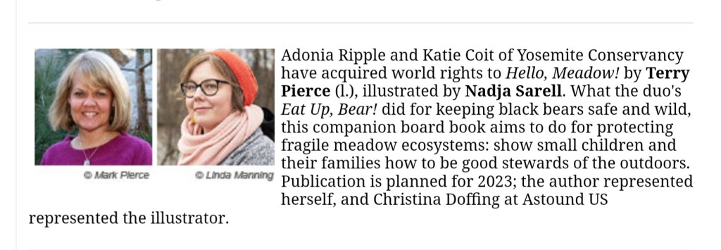 Meadows are an important part of the water cycle, not to mention habitats for many animals, and a source of beauty and calm for humans. So of course, they deserve our respect and care. Nadja Sarell will also illustrate the book. I absolutely adored her illustrations in EAT UP, BEAR! and am so excited that she agreed to illustrated HELLO, MEADOW! The book is slated to be released in 2023.